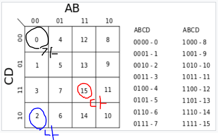 일단 4 변수 (A, B, C, D)가 있을 때 카르노 맵의 구조는 다음과 같습니다. 중요한 것은 00-01-10-11의 순서가 아니라 00-01-11-10의 순서를 가진다는 것! 이것은 00 부분의 왼쪽과 10 부분의 오른쪽을 잇는다고 생각하시면 됩니다. (몰라도 됨)