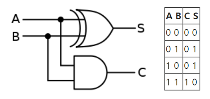 - A, B 가 모두 1일 때만 C가 1이되니 AND 게이트로 C를 구현하고